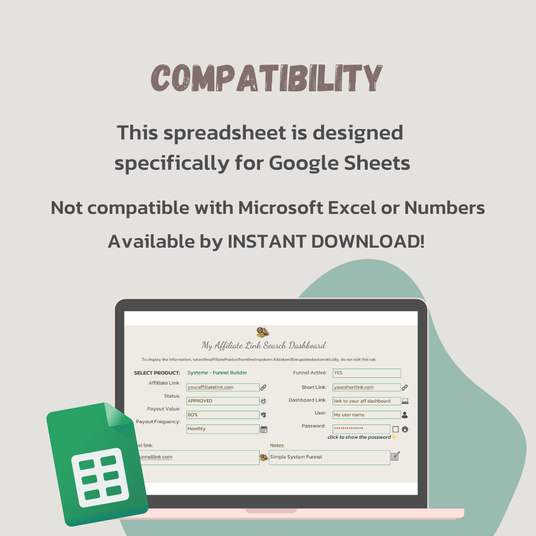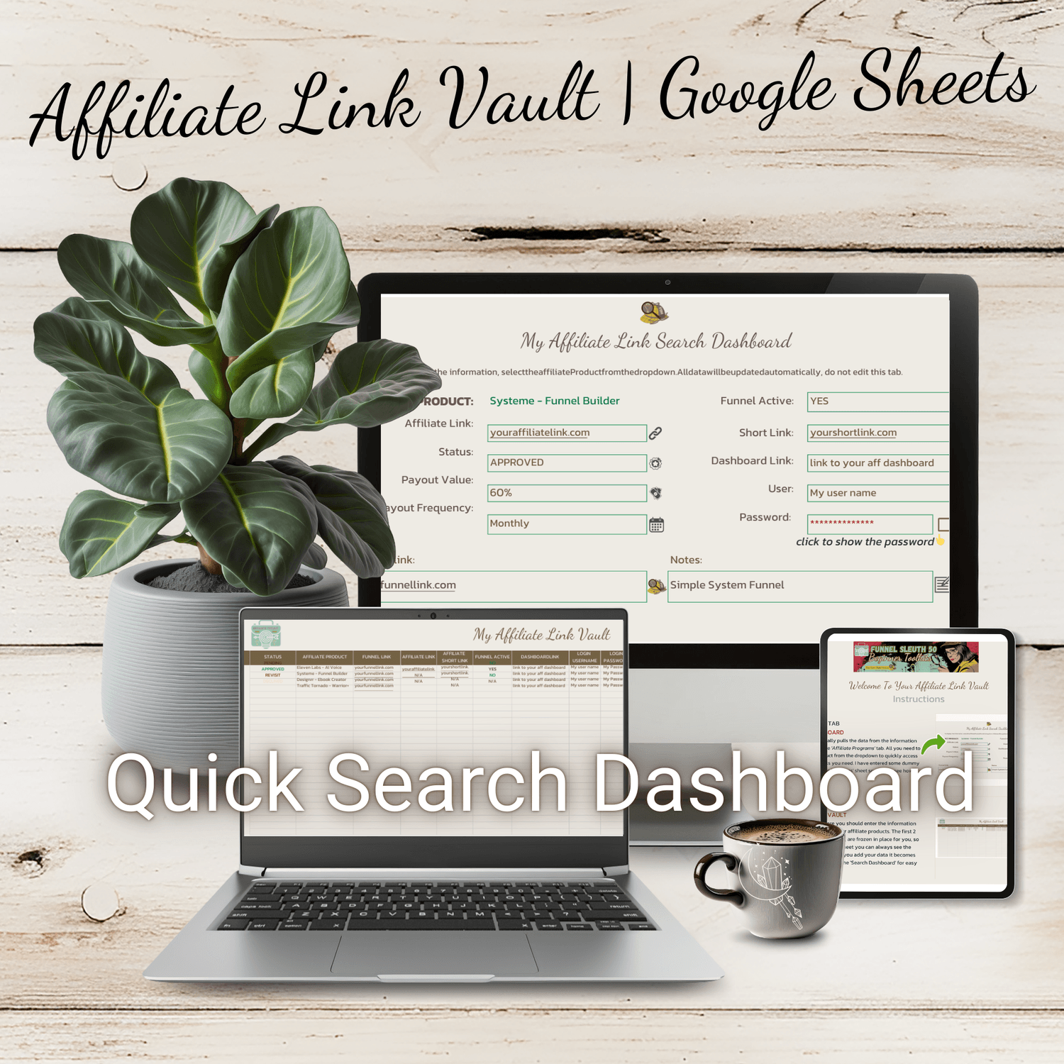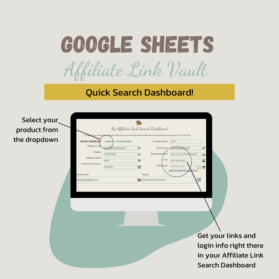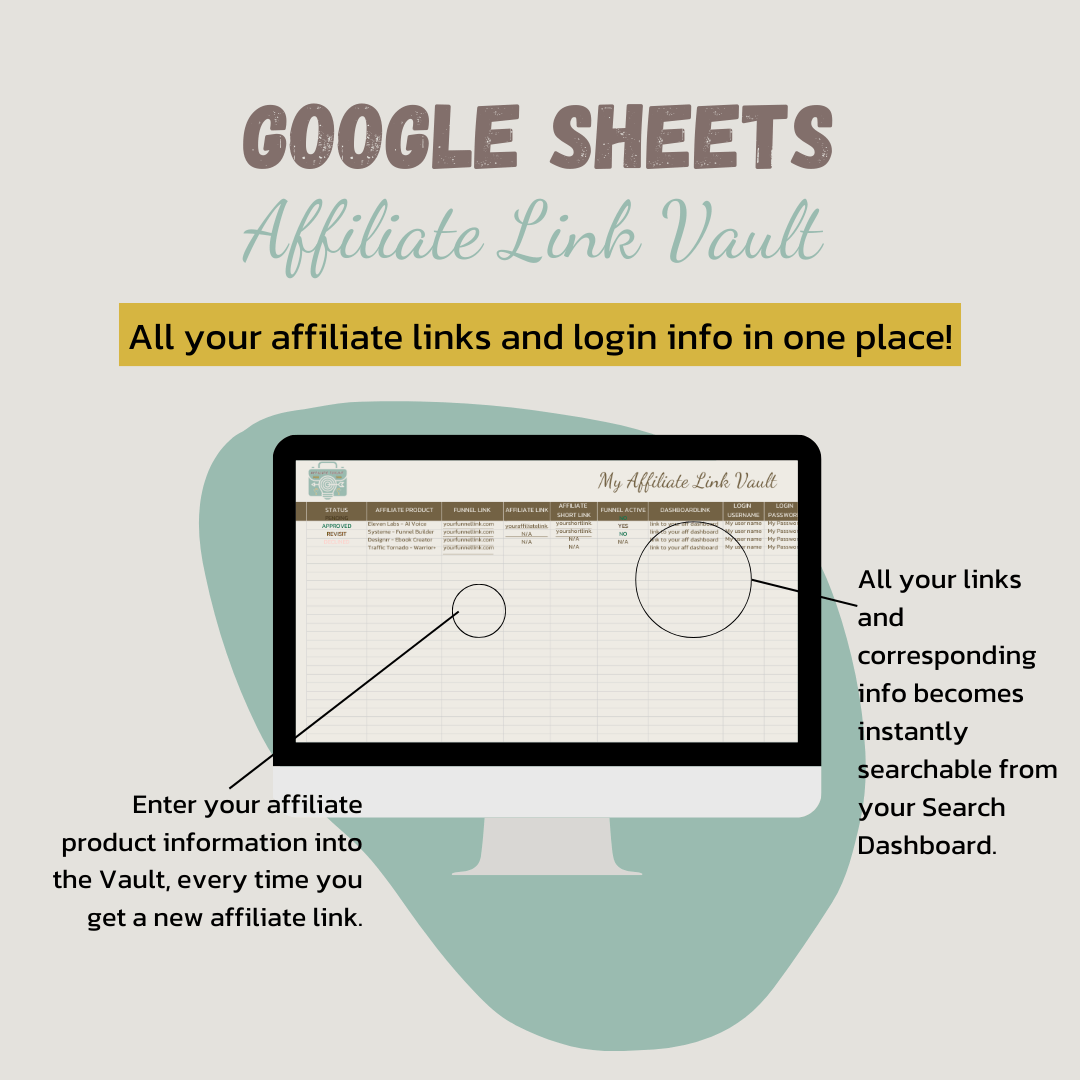 All your links organised & easily found in a done-for-you Google Sheets, Affiliate Link Vault & Search Dashboard